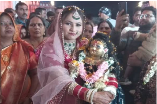 உத்தரப் பிரதேசம், பதாவுன் மாவட்டத்தைச் சேர்ந்த பிங்கி ஷர்மா(28) என்ற இளம்பெண், தனது ஆழ்ந்த பக்தியை வெளிப்படுத்தும் விதமாக, ஒரு பாரம்பரிய இந்து சடங்கின்படி கிருஷ்ணர் சிலையைத் திருமணம் செய்துகொண்டார்.