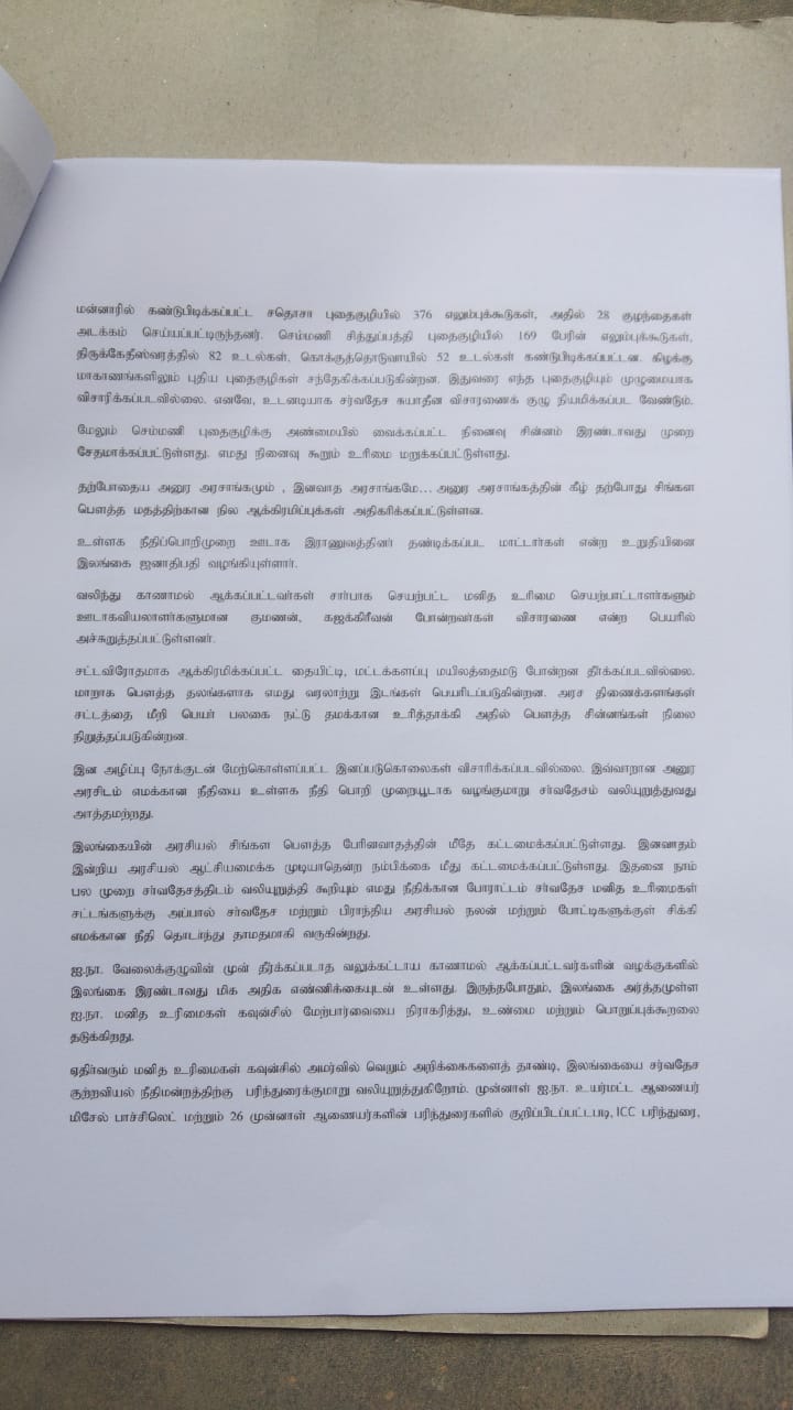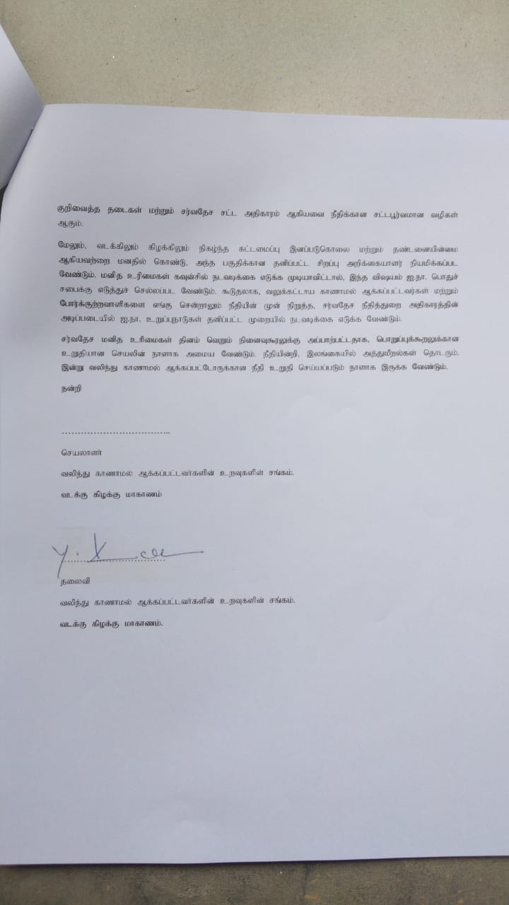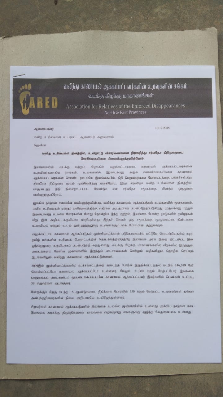 தமிழர்களுடைய உரிமை, இனப்படுகொலை விவகாரங்களிலும் மற்றும் விசேடமாக செம்மணி போன்ற வடக்கு கிழக்கிலே காணப்படும் மனிதப் புதை குழிகள் விவகாரம் போன்றவற்றிலும் சர்வதேச தலையீட்டுடனான விசாரணை பொறிமுறைகள் உருவாக்கப்பட வேண்டும் எனவும், காணாமல் ஆக்கப்பட்டோர் விவகாரத்திலும் மனித உரிமை விடயங்களிலும் சர்வதேசத்தினுடைய மேற்பார்வையும் தலையீடும் வேண்டும் எனவும் இந்த மனித உரிமைகள் தினத்திலும் சர்வதேசத்திடம் தமது கோரிக்கைகளையும் முன் வைப்பதாகவும் கருத்து வெளியிட்டிருந்தனர்.