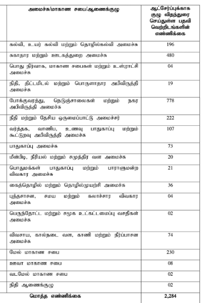 ஒவ்வொரு அமைச்சும் தமது அமைச்சின் கீழுள்ள திணைக்களங்களின் நியமனம் மற்றும் ஏனைய நிறுவனங்களில் நிலவும் பதவி வெற்றிடங்களைப் பூர்த்தி செய்வதற்காக மேற்குறித்த குழுவுக்குச் சமர்ப்பிக்கப்பட்டுள்ள கோரிக்கைகளைக் கருத்தில் கொண்டு 2025-11-14 திகதி நடைபெற்ற மேற்குறித்த அதிகாரிகள் குழுக் கூட்டத்தில் மேற்கொள்ளப்பட்டுள்ள விதந்துரைகளுக்கமைய பின்வரும் ஆட்சேர்ப்புகளை மேற்கொள்வதற்காக பிரதமர் சமர்ப்பித்த யோசனைக்கு அமைச்சரவை அங்கீகாரம் வழங்கியுள்ளது.