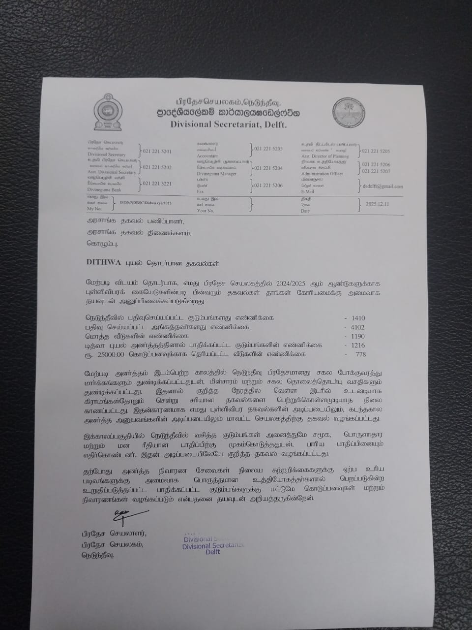 டித்வா புயல் தொடர்பாக 2024/2025 ஆம் ஆண்டுகளுக்கான புள்ளிவிபரக் கையேடுகளின்படி நெடுந்தீவு பிரதேச செயலாளரால் அரசாங்க தகவல் திணைக்களத்திற்கு அனுப்பி வைத்த அறிக்கையில் இவ்விடயம் தெரிவிக்கப்பட்டுள்ளது.