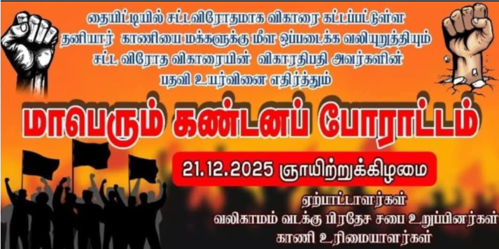 தையிட்டி சட்டவிரோத விகாரைக்கு முன்பாக நாளைய தினம் ஞாயிற்றுக்கிழமை காலை 09 மணிக்கு குறித்த போராட்டம் முன்னெடுக்கப்படவுள்ளதாக, வலி. வடக்கு பிரதேச சபை உறுப்பினர்கள் மற்றும் காணி உரிமையாளர்கள் தெரிவித்துள்ளனர்.