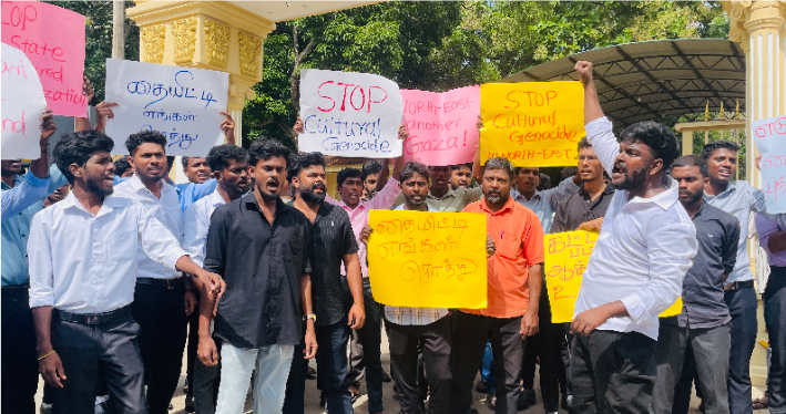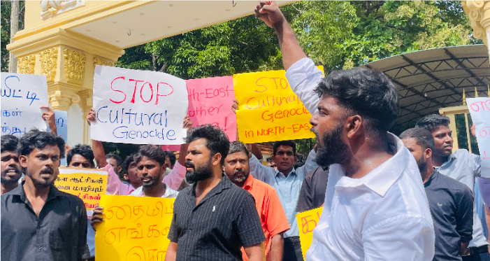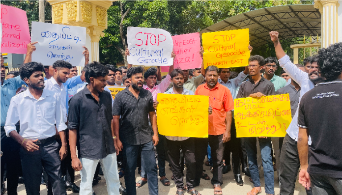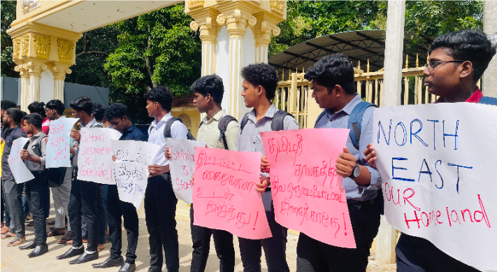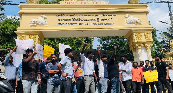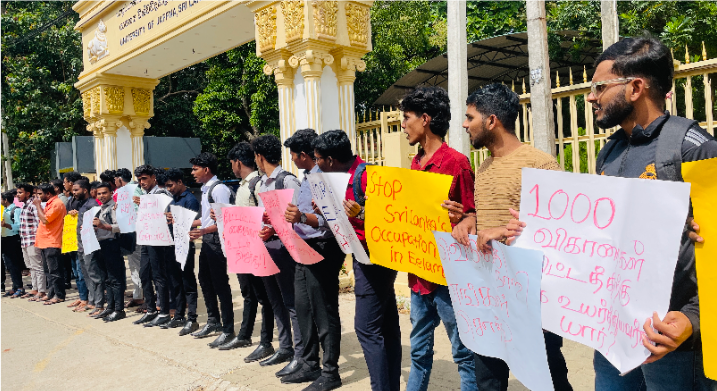 தையிட்டி விகாரைக்கு எதிராக யாழ்ப்பாண பல்கலை கழக மாணவர்கள் பல்கலை முன்பாக போராட்டத்தினை முன்னெடுத்தனர்.