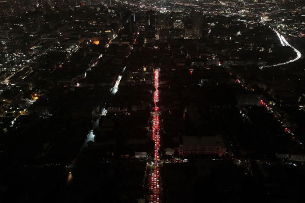 இருள் சூழ்ந்த வேளையில் வீதி நெடுகிலும் வரிசையில் நின்ற கார்களின் சமிக்ஞை விளக்குகள் மட்டும் ஒளிர்ந்த காட்சி கழுகுப் பார்வையாய் பிடிக்கப்பட்ட படங்கள் சமூக ஊடகங்களில் வைரலாகியுள்ளன.