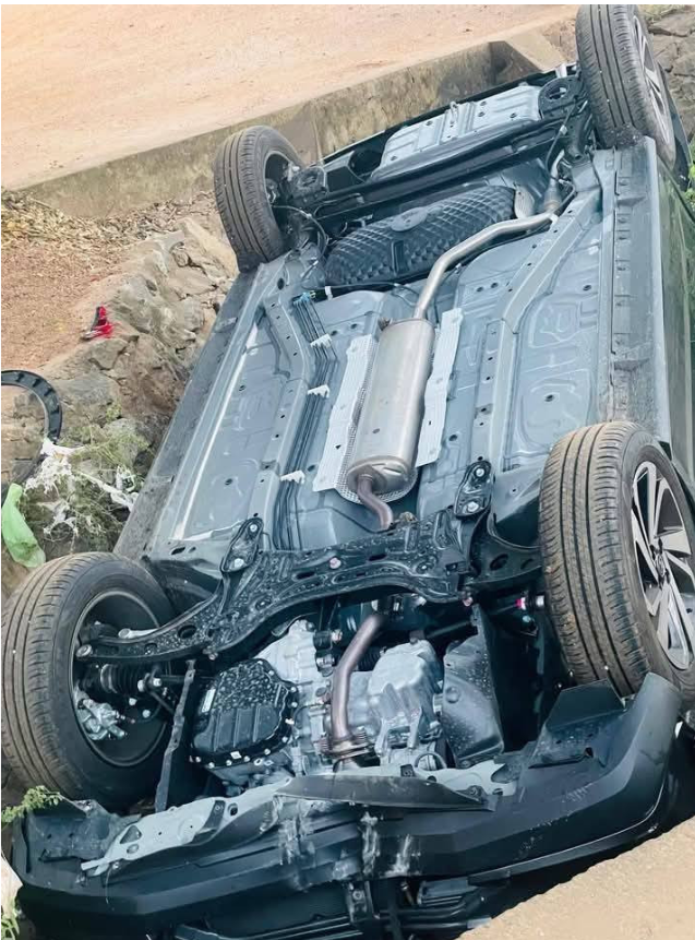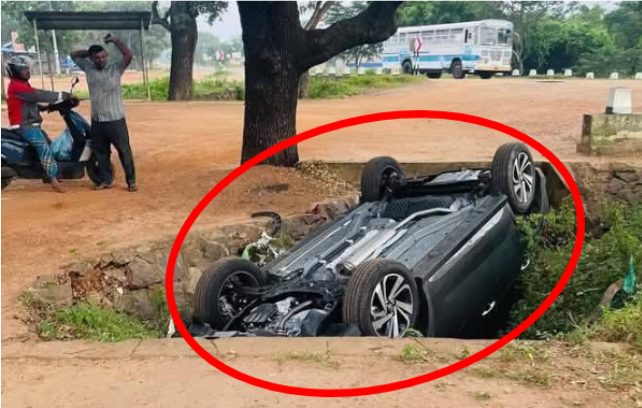 அதிவேகமாக வந்த கார் கட்டுப்பாட்டை இழந்து வீதியோரத்திலிருந்த கழிவுநீர்க் கால்வாய்க்குள் பாய்ந்து தலைகீழாகக் கவிழ்ந்து விபத்துக்குள்ளானது