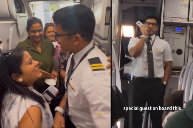 குறித்த காணொளியில், விமானி தனது தாயை அன்புடன் அணைத்து, பின்னர் பயணிகளுக்கு ஒரு நெகிழ்ச்சியான அறிவிப்பை வெளியிடுகின்றார்.