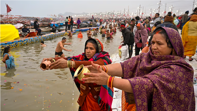 உத்தர பிரதேச மாநிலம், பிரயாக்ராஜில் உள்ள திரிவேணி சங்கமத்தில், பௌா்ணமி தினமான சனிக்கிழமை மாா்கழி மேளா திருவிழா கோலாகலமாகத் தொடங்கியது. கடும் குளிரையும் பொருள்படுத்தாமல், லட்சக்கணக்கான பக்தா்கள் புனித நீராடினா்.