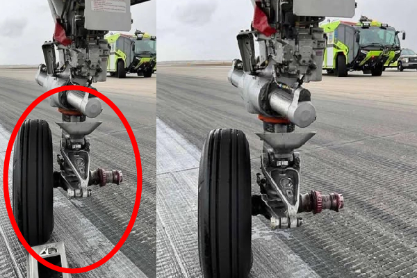 அப்போது ஏற்பட்ட கடுமையான குலுக்கலில், விமானத்தின் முன் பக்கச் சக்கரம் தனியாக கழன்று ஓடுதளத்தில் விழுந்தது.