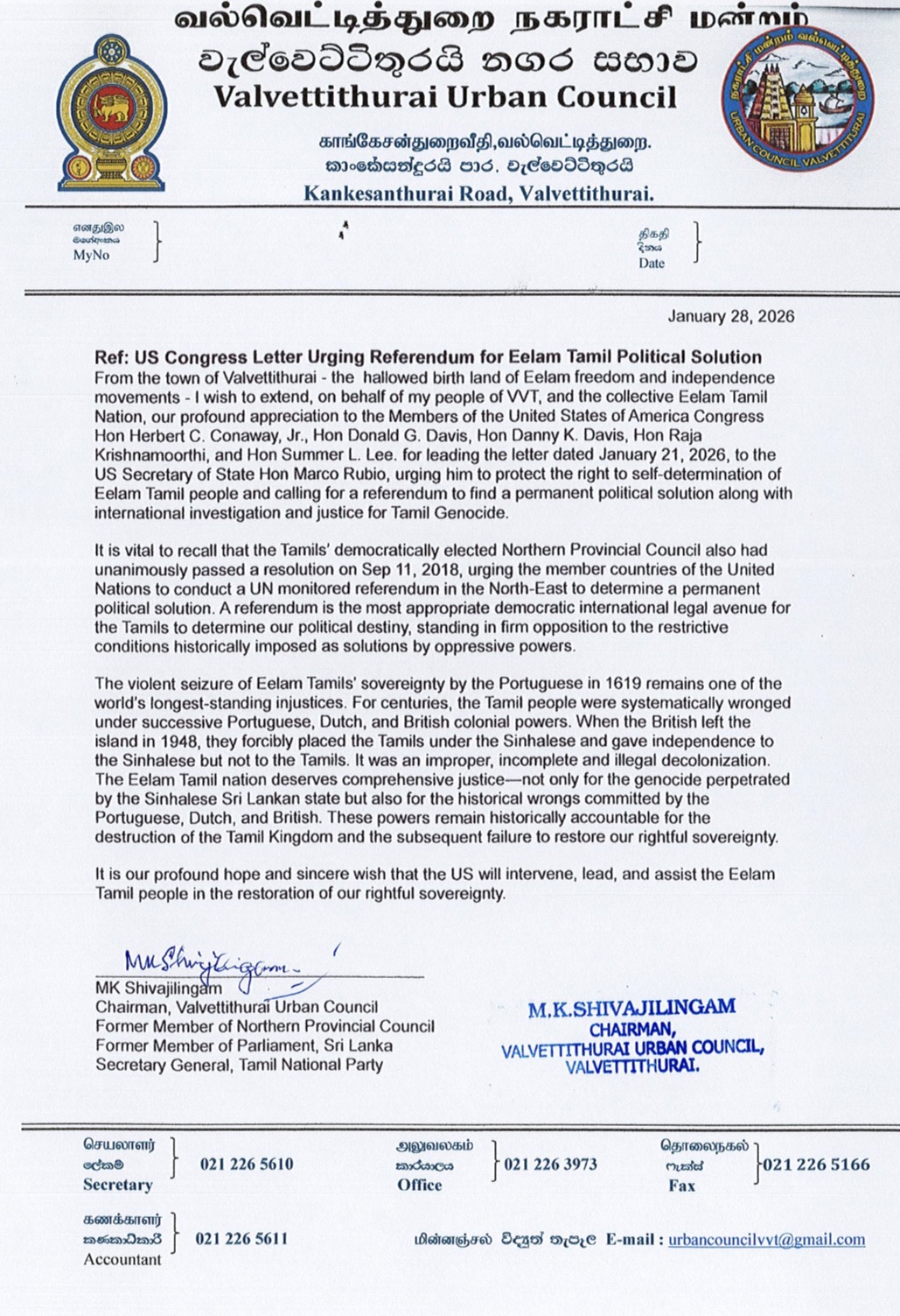 “தமிழர்களின் இறைமையை மீட்க அமெரிக்கா தலைமை தாங்க வேண்டும்” – அமெரிக்க காங்கிரஸினருக்கு சிவாஜிலிங்கம் அவசர கடிதம்.