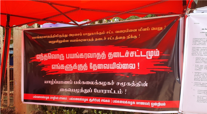 பயங்கரவாதத்திலிருந்து அரசைப் பாதுகாக்கும் சட்ட வரைபினை மீளப் பெறு என்றும் தற்போதுள்ள பயங்கரவாதத் தடைச் சட்டத்தை நீக்கு என வலியுறுத்தி பல்கலைக்கழக ஊழியர் சங்கம், பல்கலைக்கழக ஆசிரியர் சங்கம் மற்றும் பல்கலைகழக மாணவர் ஒன்றியம் ஆகியன இணைந்து குறித்த போராட்டத்தை முன்னெடுத்துள்ளனர்.