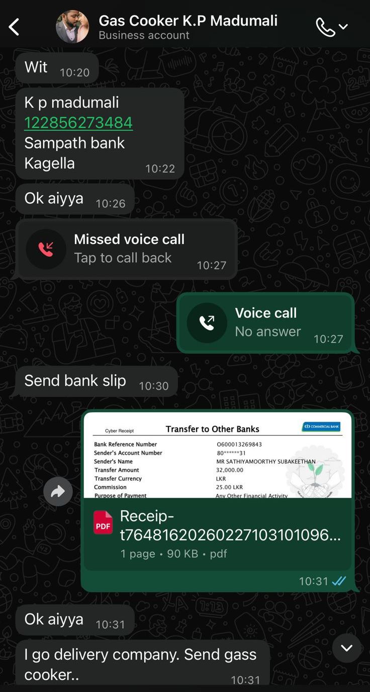 அதன் அடிப்படையில், காஸ் குக்கரின் விலையான 32 ஆயிரம் ரூபாயை அவர்கள் கூறிய வங்கி கணக்கு இலக்கத்திற்கு வைப்பிலிட்டு ,அதனை வாட்ஸ்அப் ஊடாக தெரியப்படுத்தியுள்ளார்.