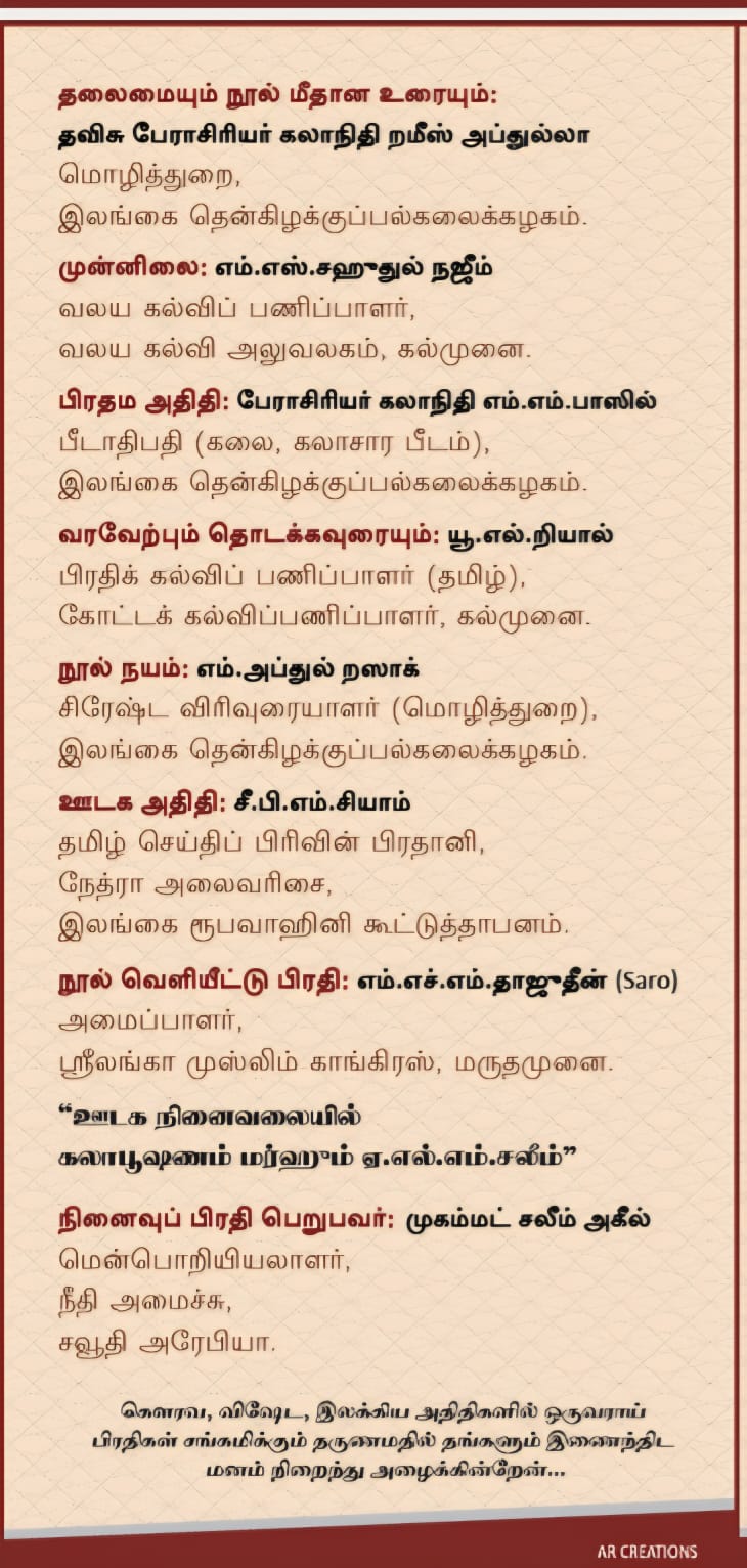 விழாவின் தொடக்கவுரையினை கல்முனை வலயக் கல்வி அலுவலக தமிழ் மொழிக்கான பிரதிக் கல்விப் பணிப்பாளர் யூ.எல்.றியால் நிகழ்த்தவுள்ளதுடன் தென்கிழக்குப் பல்கலைக்கழக மொழித்துறை சிரேஷ்ட விரிவுரையாளர் எம்.அப்துல் றஸாக் நுால் ஆய்வுரையினை நிகழ்த்துவார்.