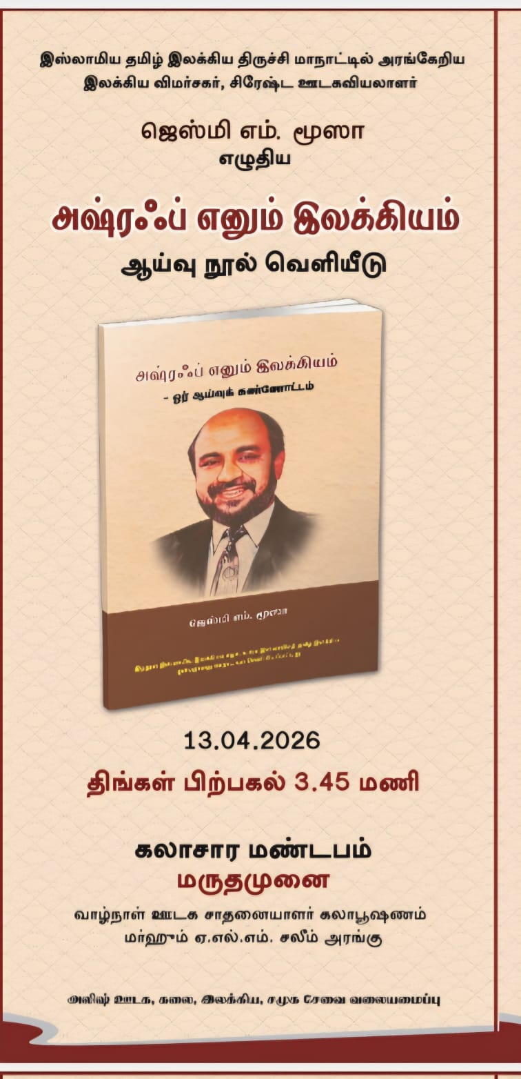 உலக இஸ்லாமிய தமிழ் இலக்கிய திருச்சி மாநாட்டில் அரங்கேறிய இலக்கிய விமர்சகரும், சிரேஷ்ட ஊடகவியலாளரும் வருகைதரு விரிவுரையாளருமான ஜெஸ்மி எம்.மூஸா எழுதிய “அஷ்ரஃப் எனும் இலக்கியம்” ஆய்வு நூல் வெளியீட்டு விழா மருதமுனை கலாசார மண்டபத்தில் எதிர்வரும் திங்கட் கிழமை(13) மாலை 3.45 மணிக்கு நடைபெறவுள்ளது