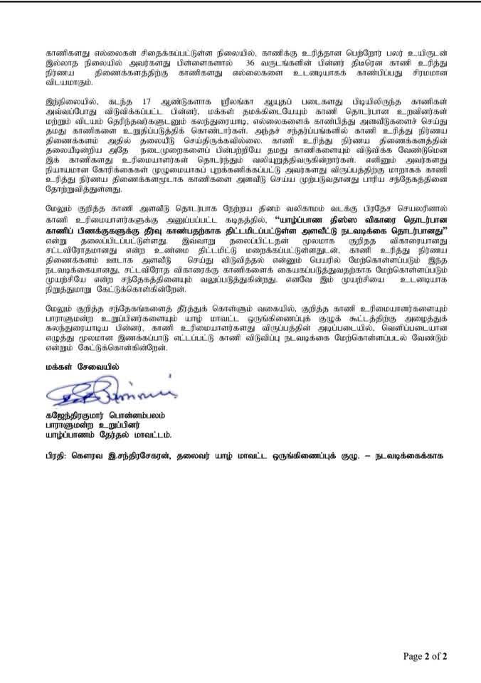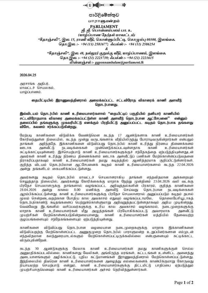 அவர்களது கடிதம் தொடர்பில் மாவட்டச் செயலாளராகிய தாங்கள் எந்தவிதமான அக்கறையும் செலுத்தாத நிலையில், அவர்களது கோரிக்கைக்கு மாறாக நேற்று முன்தினம் 23.04.2026 வலி வடக்கு பிரதேச செயலாளருக்கு தாங்களால் வழங்கப்பட்ட அறிவுத்தல்களின் பிரகாரம், குறித்த காணிகளை 28.04.2026 அன்று காலை 8.00 மணிக்கு அளவீடு செய்வது தொடர்பான நடவடிக்கைகள் ஆரம்பிக்கப்பட்டுள்ளது.