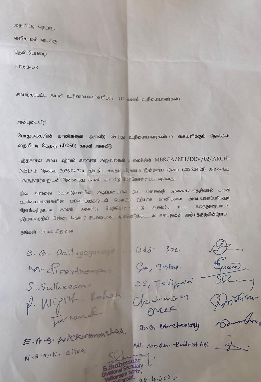 நீண்ட இழுபறியின் பின்னர் காணி அளவீட்டு பணிக்களுக்காக வந்திருந்த நில அளவை திணைக்களம் , தொல்லியல் திணைக்களம் , புத்த சாசன அமைச்சின் அதிகாரிகள் மாவட்ட செயலர் , பிரதேச செயலர் உள்ளிட்ட 07 தரப்பினரும் ஒரு கடிதத்தில் ஒப்பம் வைத்து கையெழுத்திட்டனர்.
